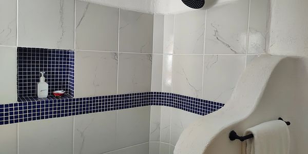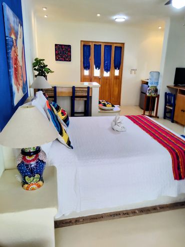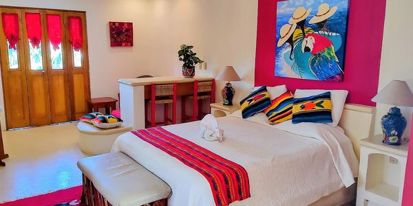 Mar y Suenos has 6 studio apartments (2 on each floor) and a Suite building with 2 suites on each floor. Apartments in our vacation rental complex feature private balconies with jungle, pool or ocean views, sitting areas, fully equipped kitchenettes (coffee maker, refrigerator, microwave, stove top and cooking utensils and plates), and a queen-size bed. One studio offers 2 queen beds and can accommodate 4 guests. Studios have a modern beachy, Mexican blue or red decor theme. We provide 5 gallons of purified water and will stock refrigerators with beer and wine upon request.