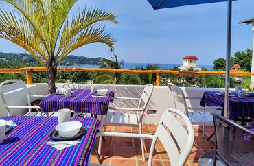 Our rooftop garden terrace features sweeping ocean views, a breakfast cafe (8:30 - 10:30 ) where our daily complementary continental breakfast is served, lounge chairs, tables, chairs and both shaded and sunny areas . This area is available in the afternoons and evenings for guests to enjoy the incredible ocean views and sunsets.